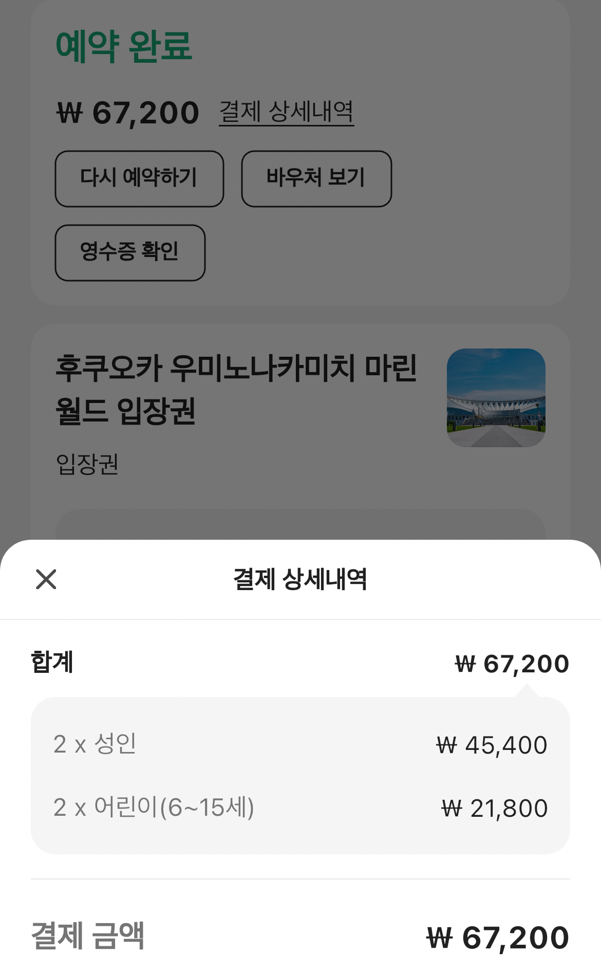 마린월드는 성인 2명 아이 2명 해서 67,200원이네요. 미리 클룩에서 예약했습니다.